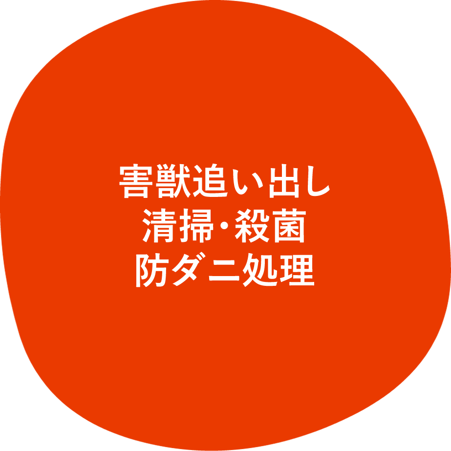 20年以上の駆除歴を持つベテランが最短で1日で駆除と侵入封鎖を行います。駆除後には、清掃、殺菌、防ダニ処理を行い、最長5年の保証を提供いたします。